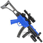 The HY017B is a UMP style spring airsoft BB gun. This gun is in the JBBG orange and black and has many great features. The HY017B from SYMA has a tactical fixed stock that can be removed for transportation. It has a front grip with built-in LED coloured torch, which slides onto the under rail system of the gun. It has two rail covers loaded on each side of the gun’s rail system. The scope is a dummy with no actual targeting capability or red dot function; however, the gun’s pin sights are good. The gun has a cocking handle located on the front left of the gun, making it easy to set the gun ready to fire. The magazine has a 14 round capability and is easy to reload at any time.
